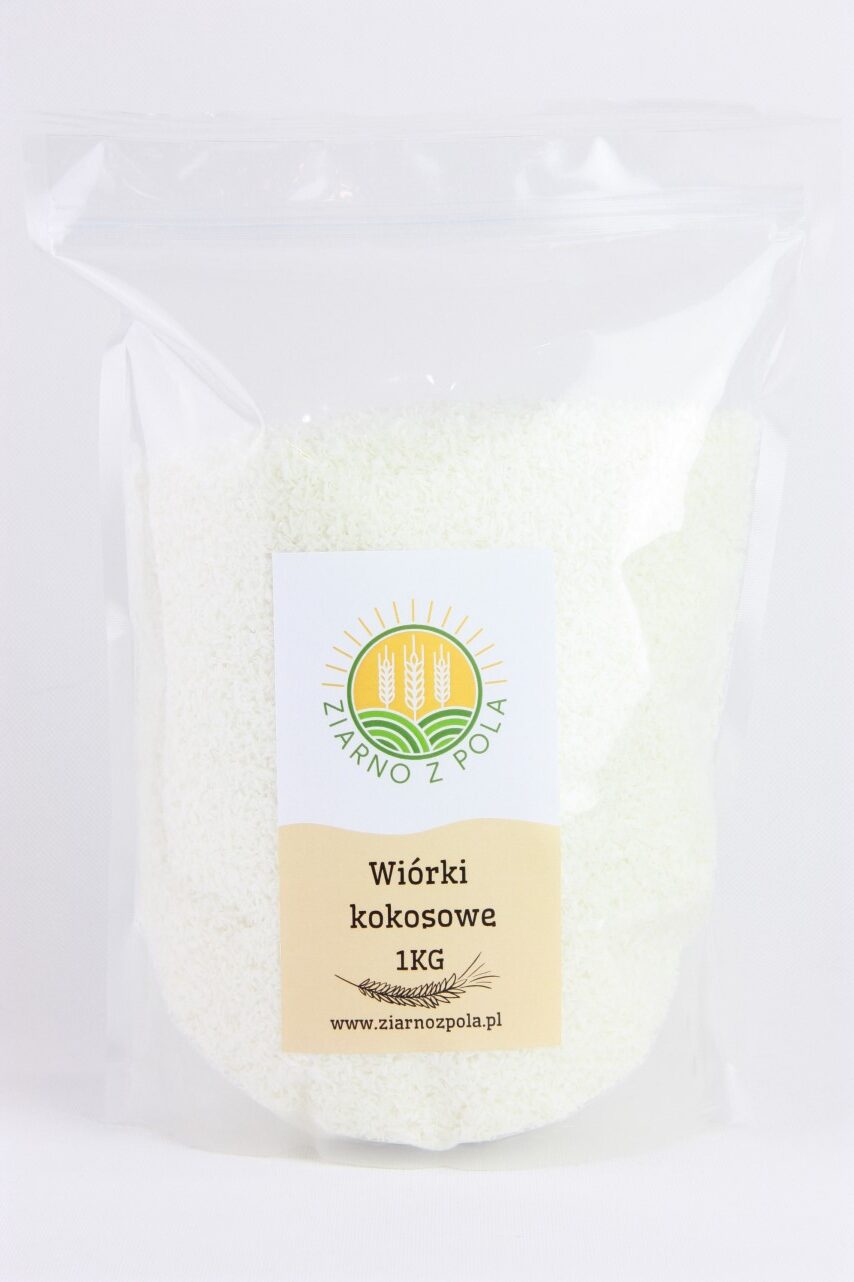 Wiórki kokosowe są pakowane w grubych torebkach strunowych, pozwalające na wielokrotne otwieranie i zamykanie.